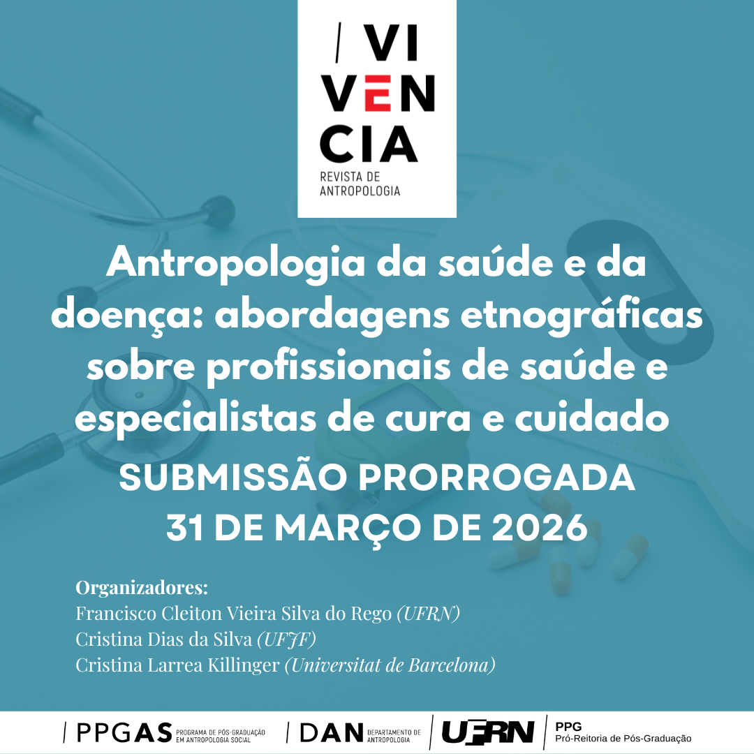 A Vivência: Revista de Antropologia informa que o prazo para envio de artigos destinados ao dossiê “Antropologia da saúde e da doença: abordagens etnográficas sobre profissionais de saúde e especialistas de cura e cuidado” foi prorrogado para o dia 31 de março de 2026.