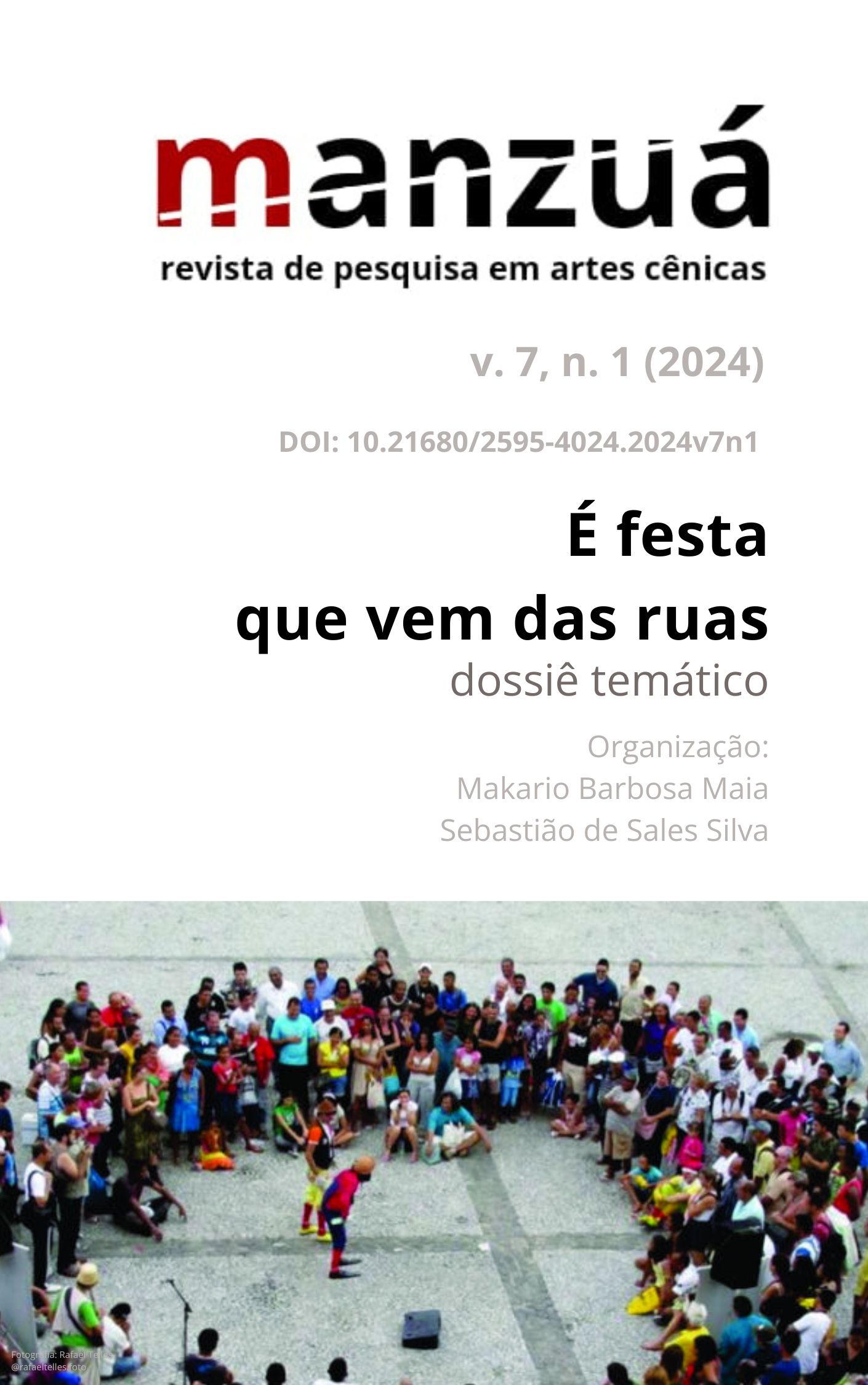 v. 7 n. 1 (2024)No sétimo volume, número 01, da Manzuá – Revista de Pesquisa em Artes Cênicas, publicamos o dossiê temático “É festa que vem das ruas”, organizado pelos professores Makarios Barbosa Maia (UFRN) e Sebastião de Sales Silva (IFTO). O dossiê reúne artigos, ensaios e relatos de pesquisas que se vinculam com temáticas que se originam nas ruas e em comunidades do Brasil, da América Latina e, ainda, da África.